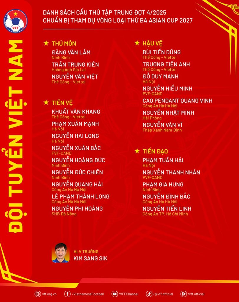 Trong khi đó, hai thủ môn Nguyễn Filip và Nguyễn Đình Triệu không có tên trong danh sách chính thức. Thay vào đó, HLV Kim Sang Sik tin tưởng vào Nguyễn Văn Việt (Thể Công Viettel) và Trần Trung Kiên (HAGL), những thủ môn trẻ đang có phong độ cao tại V.League 1.
