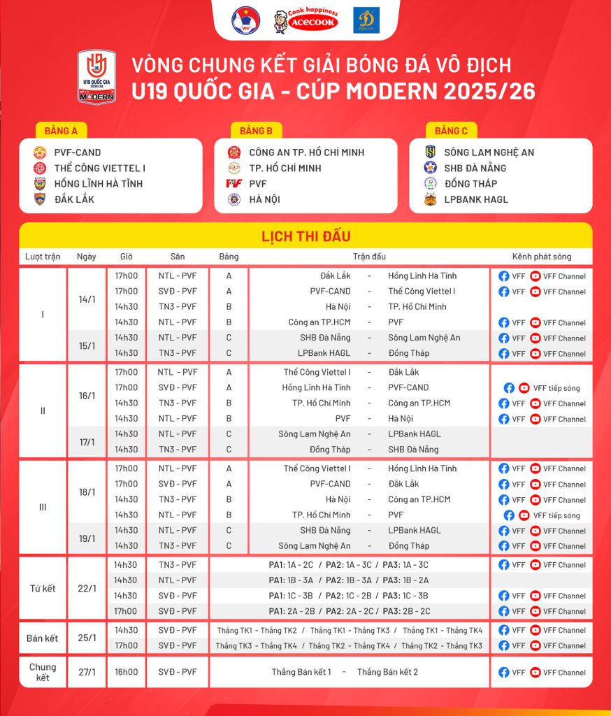 Ở loạt trận đầu tiên diễn ra chiều ngày 14/1, Đắk Lắk sẽ đối đầu Hà Tĩnh, PVF – CAND gặp Thể Công Viettel I, Hà Nội đối đầu TPHCM, Công an TPHCM sẽ chạm trán PVF. Trong khi đó, Đà Nẵng gặp SLNA và HAGL đối đầu Đồng Tháp vào ngày 15/1. Các trận đấu sẽ được trực tiếp trên kênh Youtube VFF Channel.