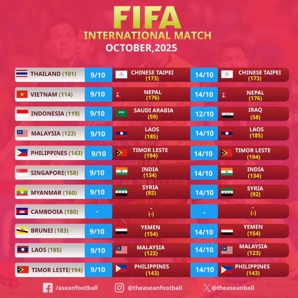 Trong khi đó, Singapore gặp Ấn Độ tại bảng C, Brunei gặp Yemen tại bảng B và Philippines gặ Timor Leste tại bảng A. Tất cả các trận đấu của các đội Đông Nam Á ở vòng loại Asian Cup đều diễn ra trong hai ngày 9/10 và 14/10. Đội duy nhất thuộc Đông Nam Á không thi đấu trong loạt trận FIFA Days tháng 10 là Campuchia