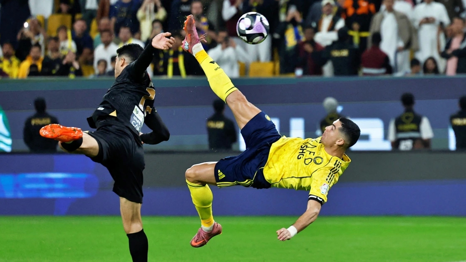 Phút 74, từ quả tạt hoàn hảo của Nawaf Boushal bên cánh phải, Ronaldo bật cao, tung người móc bóng đưa bóng đi căng vào góc cao khung thành. Thủ môn Al Khaleej chỉ biết đứng nhìn khi quả bóng găm thẳng vào lưới, còn các khán giả trên sân đồng loạt bật dậy trong sự kinh ngạc.